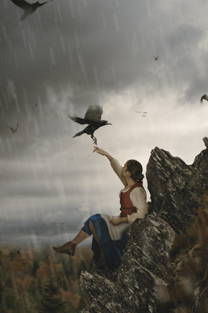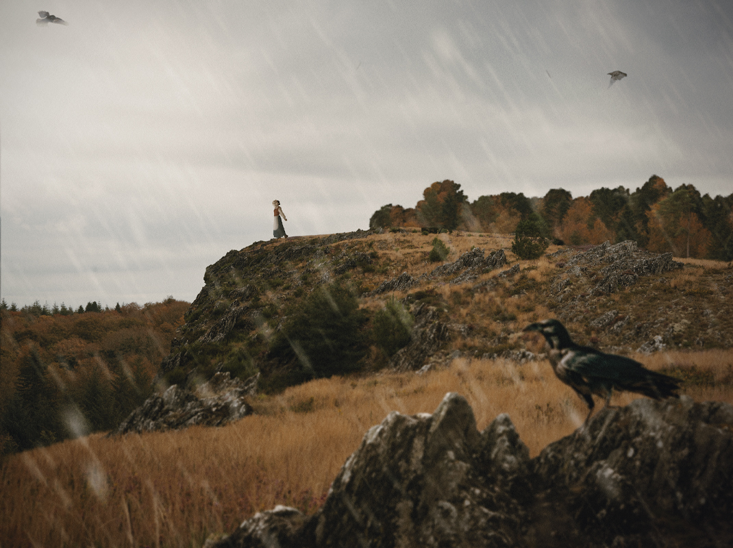 Elle erra toute la journée sur les grées, sous la pluie battante. Pourtant, à mesure que les heures passaient, une étrange paix l’envahit. Loin des cris et des ordres, la lande semblait l’accueillir comme une promesse de liberté. Rozen ne rentra jamais. Avec les pierres arrachées au sol, elle bâtit une petite maison, humble mais solide, nichée contre la falaise. Un jour, elle recueillit un corbeau blessé. Elle le soigna, le nourrit, et l’oiseau resta. Puis d’autres vinrent. Année après année, Rozen vécut entourée de centaines de corbeaux, devenus sa seule famille.